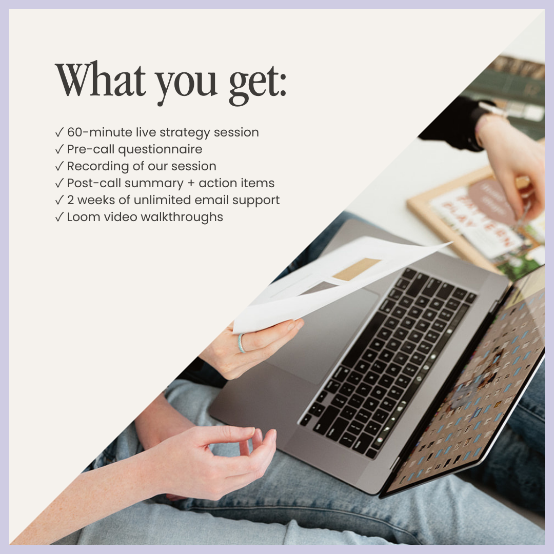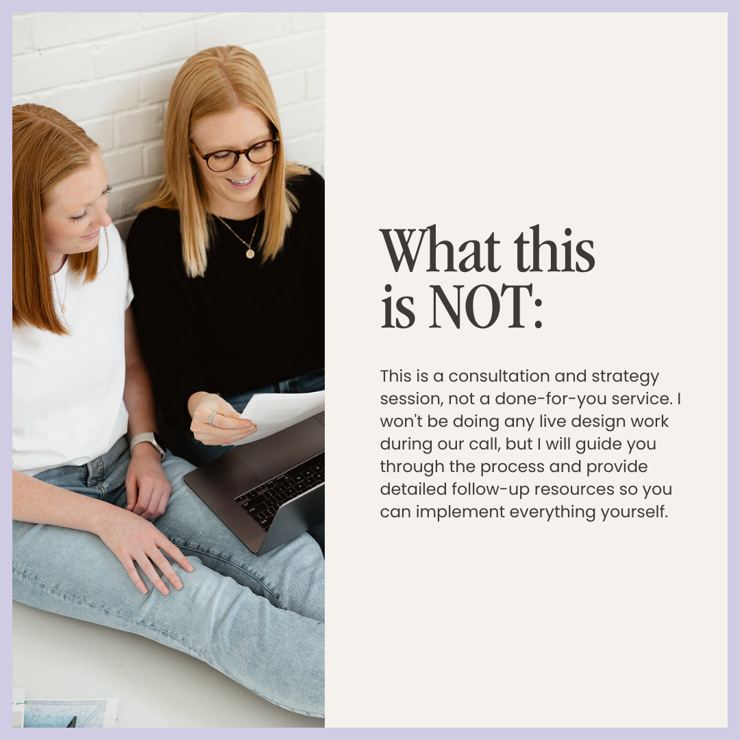 This is a consultation and strategy session, not a done-for-you service. I won't be doing any live design work during our call, but I will guide you through the process and provide detailed follow-up resources so you can implement everything yourself.