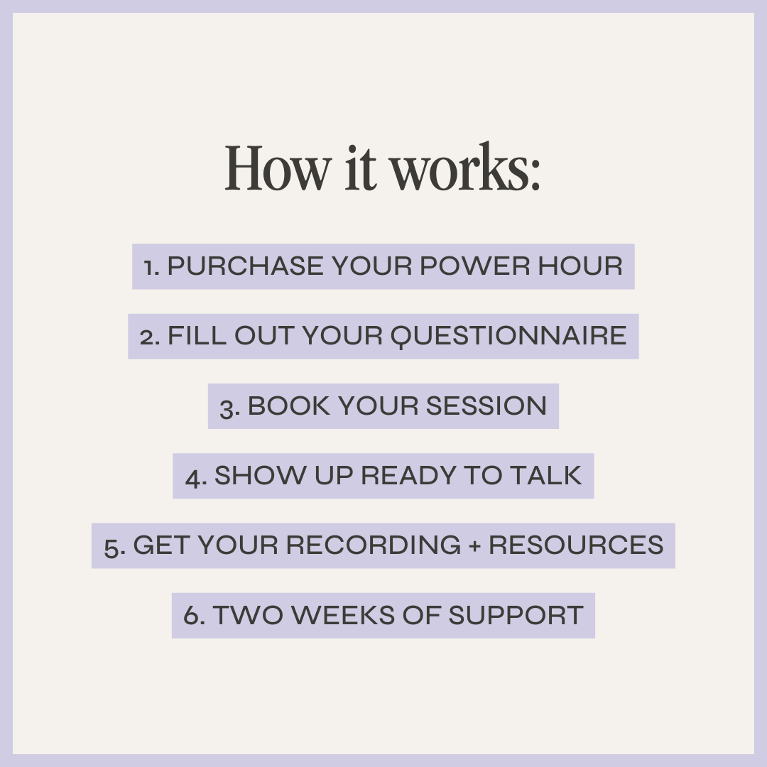 1. Purchase your Power Hour After checkout, you'll receive an email within 24 hours with next steps.